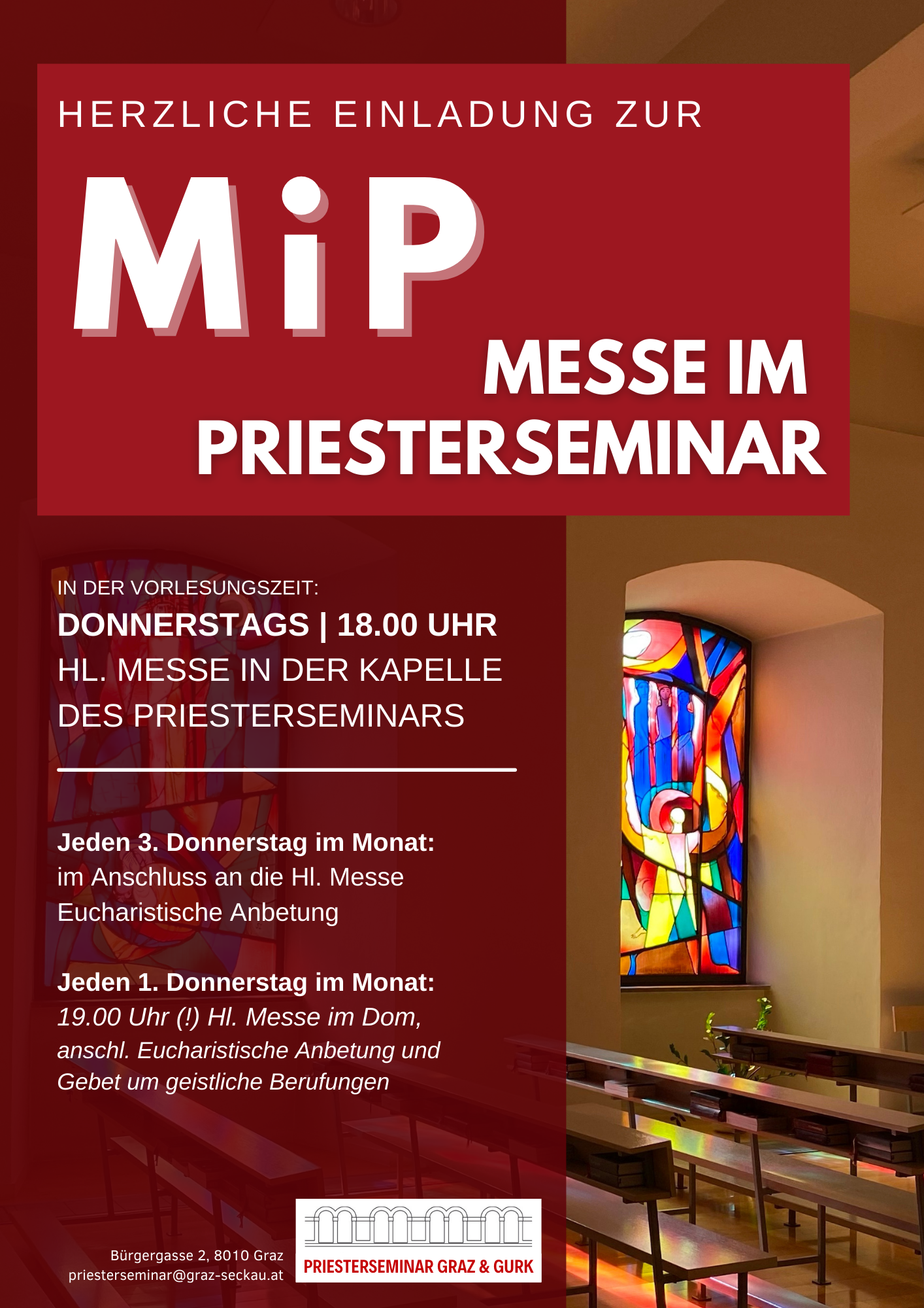Jeden Donnerstag in der Vorlesungszeit findet donnerstags auch um 18.00 Uhr die Hl. Messe in der Kapelle des Priesterseminars statt. Herzliche Einladung an alle Studierenden zur Mitfeier!