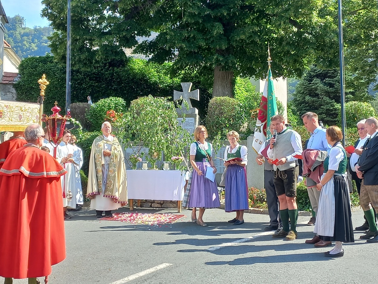 Bei prächtigem Wetter wurde Fronleichnam heuer am Donnerstag, dem 16. Juni in der Marktgemeinde Peggau gefeiert. Die festlich gestaltete Heilige Messe wurde von Prof. Helmut Schlacher in der Margarethenkirche zelebriert und musikalisch vom Gesangsverein Peggau-Deutschfeistritz und der Musikkapelle Peggau-Deutschfeistritz sehr stimmungsvoll begleitet. Anschließend führte die Fronleichnamsprozession durch den Ort bis zum Franz-Tieber-Platz. Die Oberlandler Deutschfeistritz-Peggau, die Kameradschaft vom Edelweiß und der Obst- und Gartenbauverein Deutschfeistritz-Peggau nahmen an den Feierlichkeiten ebenfalls teil. Herr Bürgermeister Hannes Tieber bedankte sich bei den Vereinen mit Peggau-Gutscheinen.