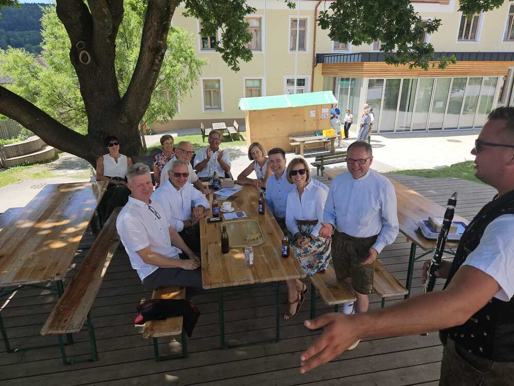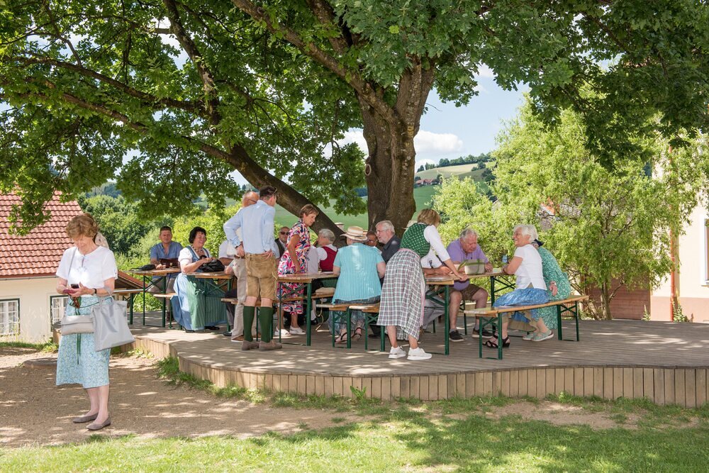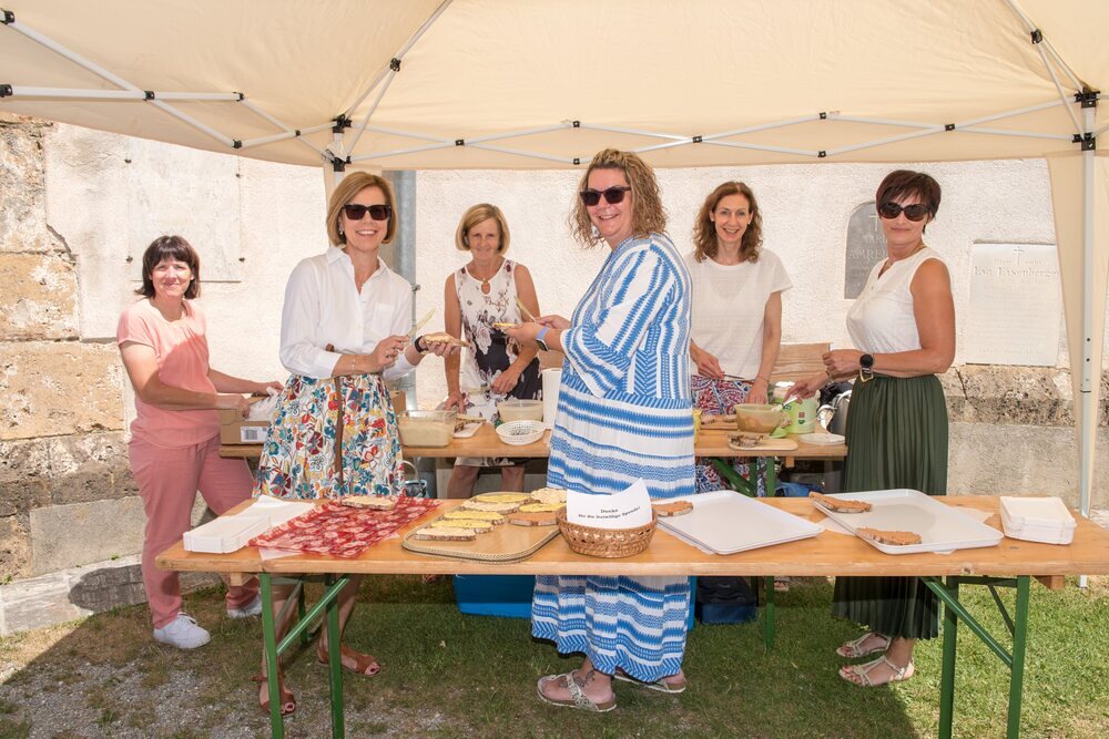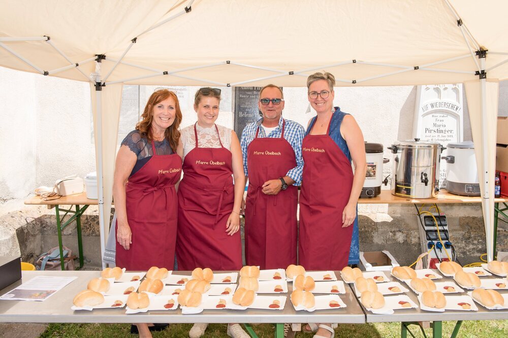 Gesellig ging es vor der Kirche weiter: Kühle Getränke halfen bei der hohen Temperatur, Frankfurter, Aufstrichbrote und Kuchen gegen den Hunger, außerdem war unter anderem für musikalische Unterhaltung gesorgt. Insgesamt war dieses Startfest eine Premiere:  Die sieben Pfarren Röthelstein, Frohnleiten mit Adriach, Übelbach, Deutschfeistritz mit Peggau, Stübing, Gratkorn und Semriach haben Messfeier und Fest miteinander und gemeinsam vorbereitet und organisiert.  Der Start in die Zukunft Kirche bei uns ist gelungen!