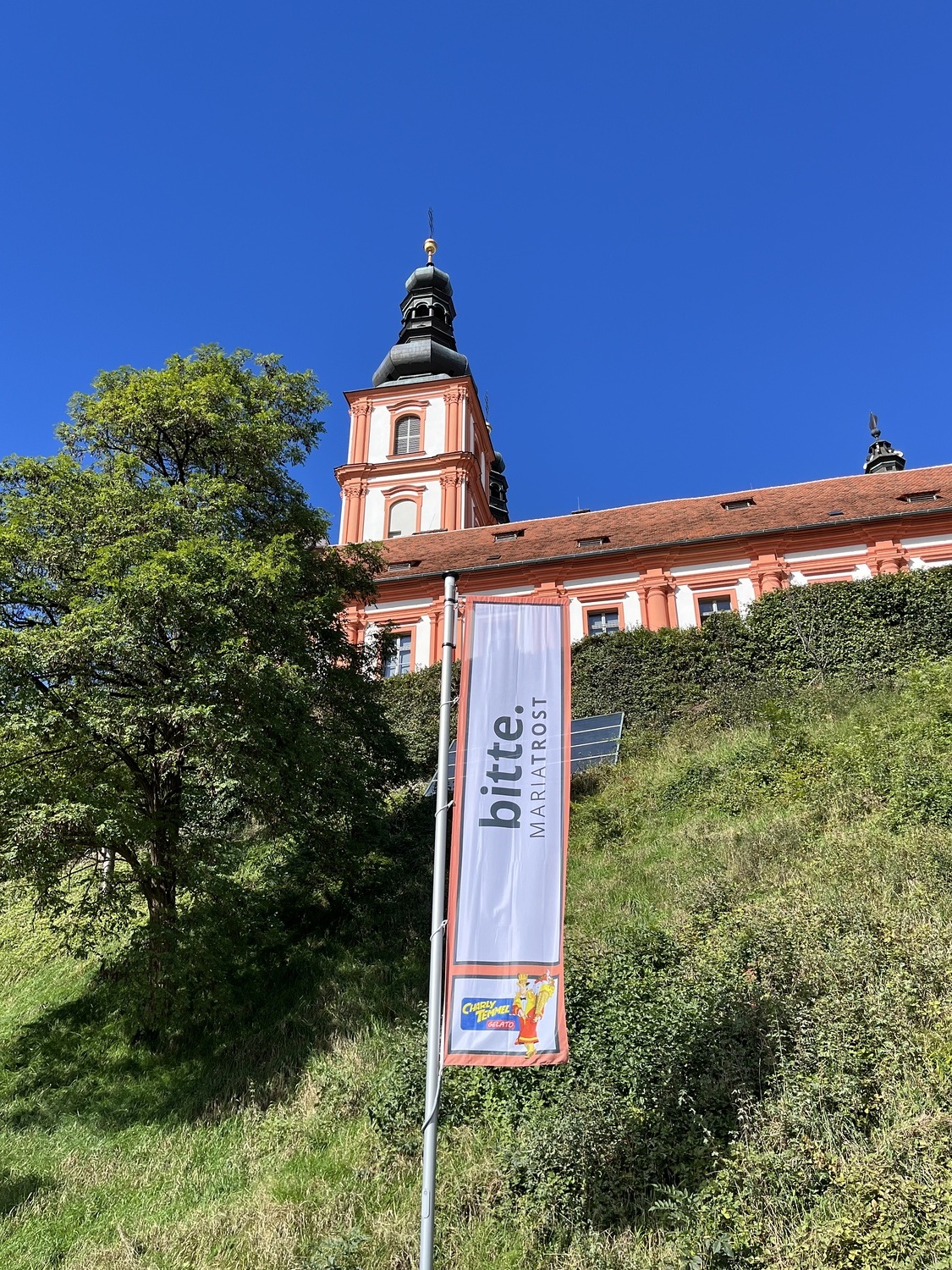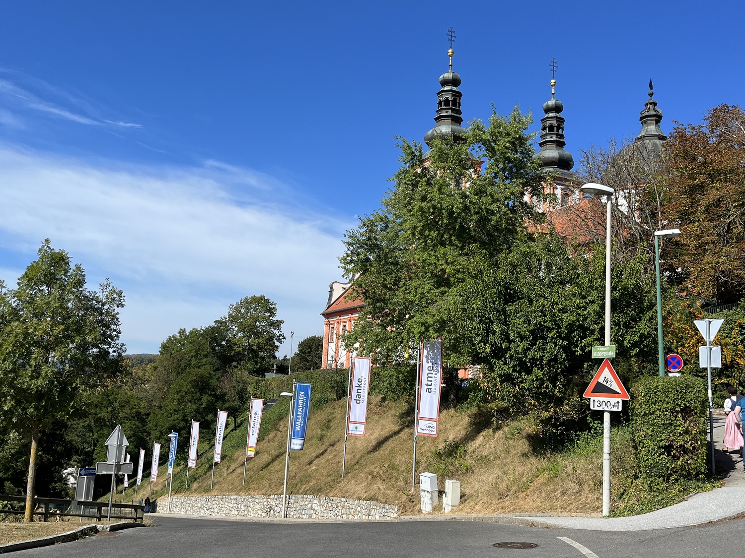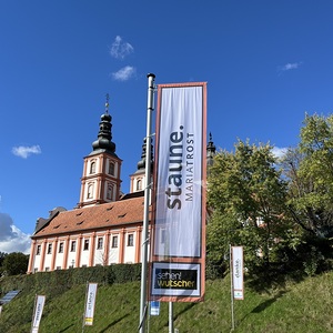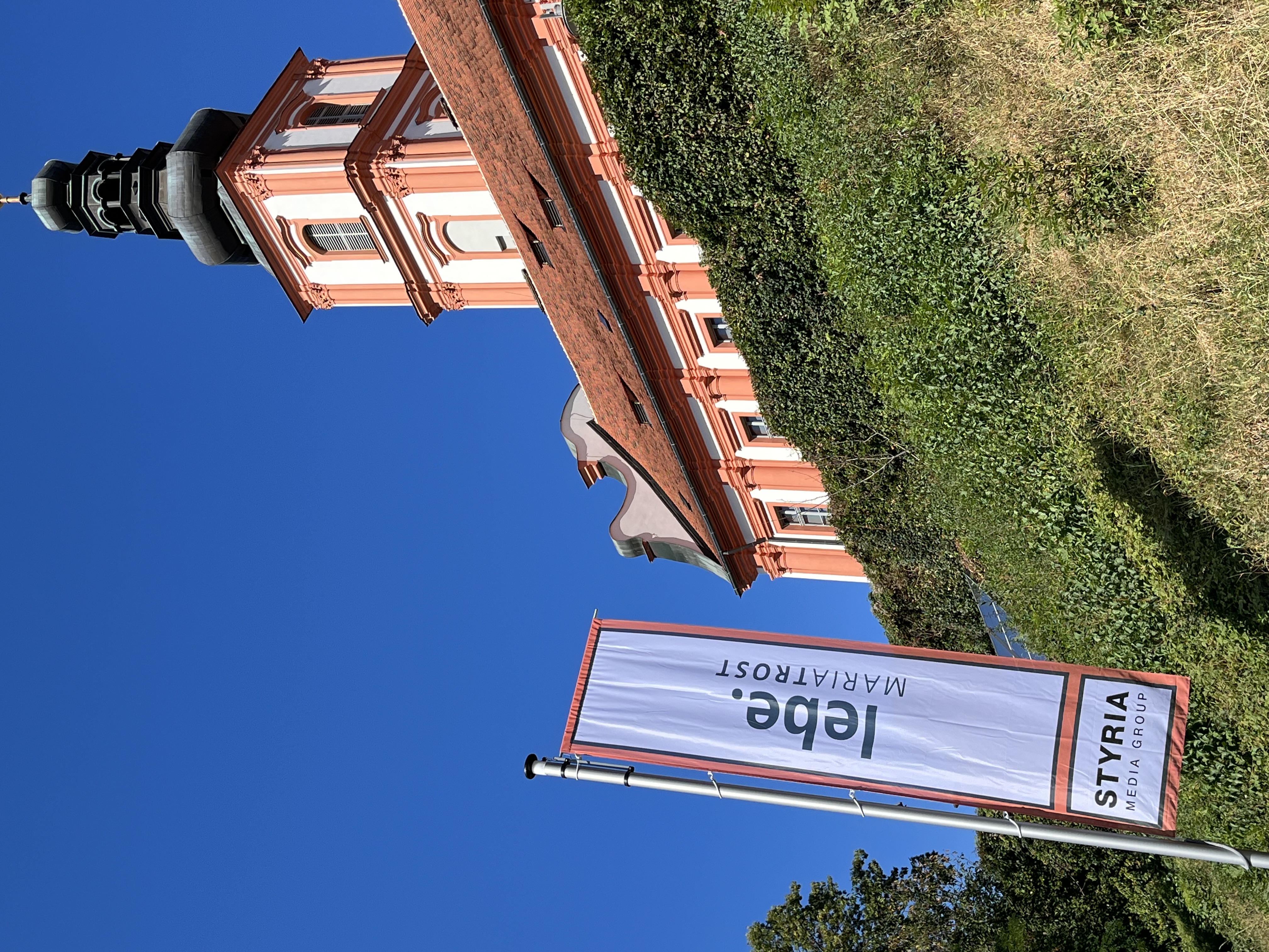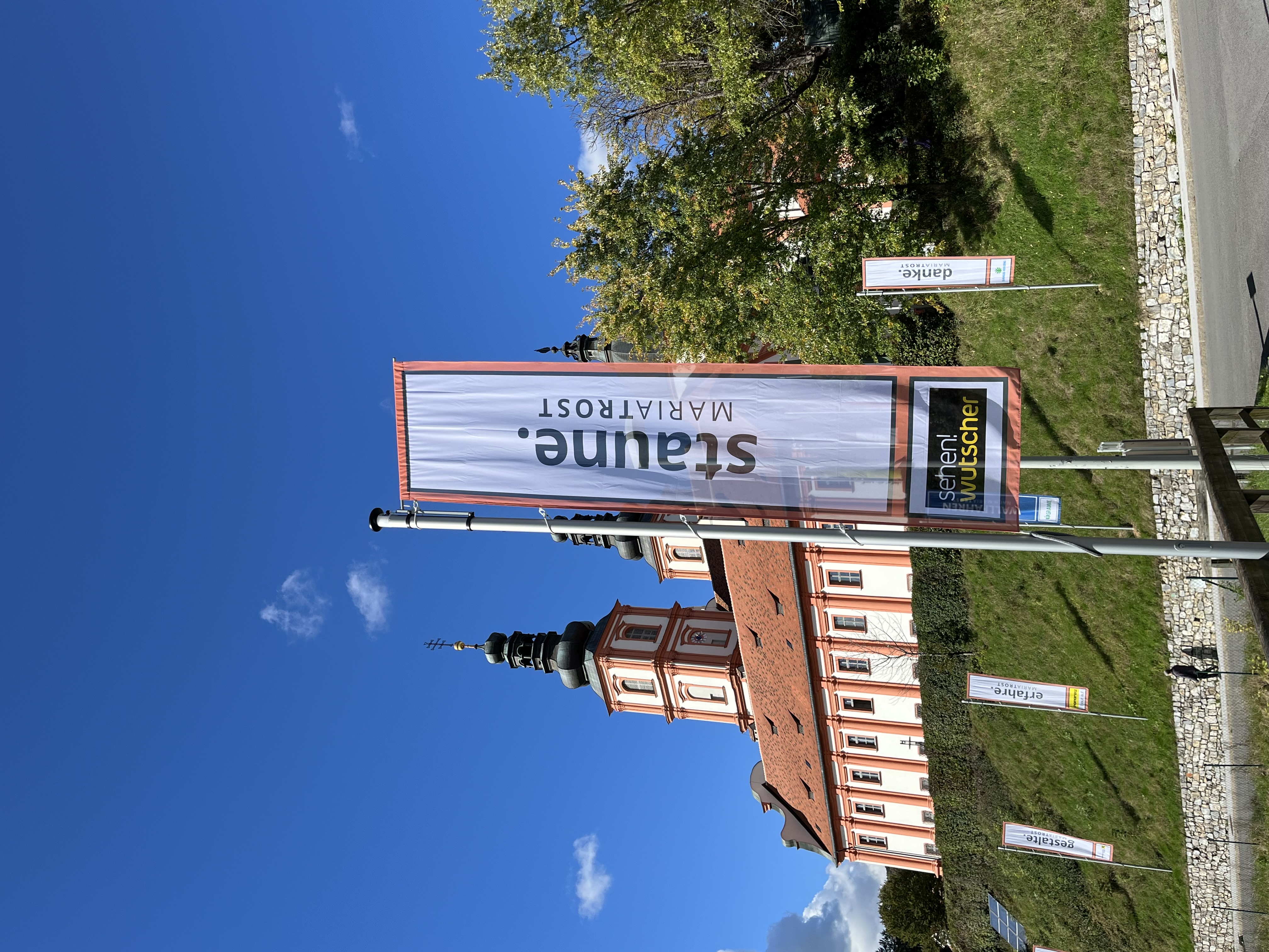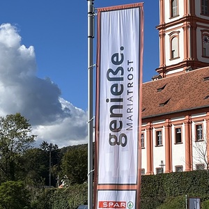 Mit einem Gedankenimpuls laden die Fahnen die Besuchenden zu einem vielfältigen Erleben von MARIATROST ein.