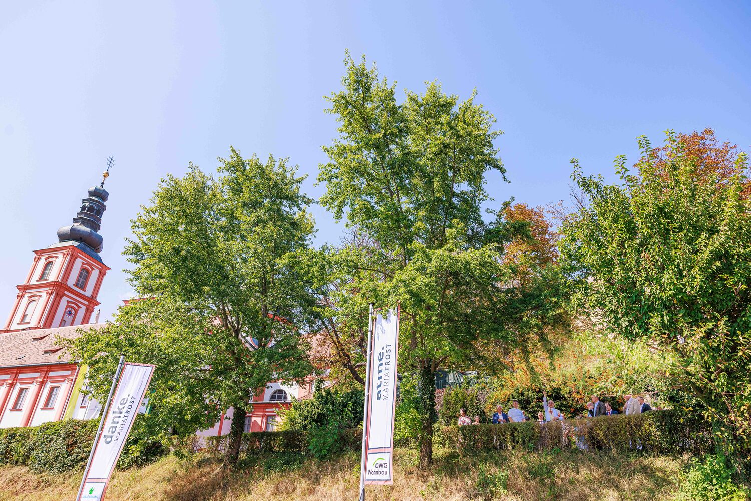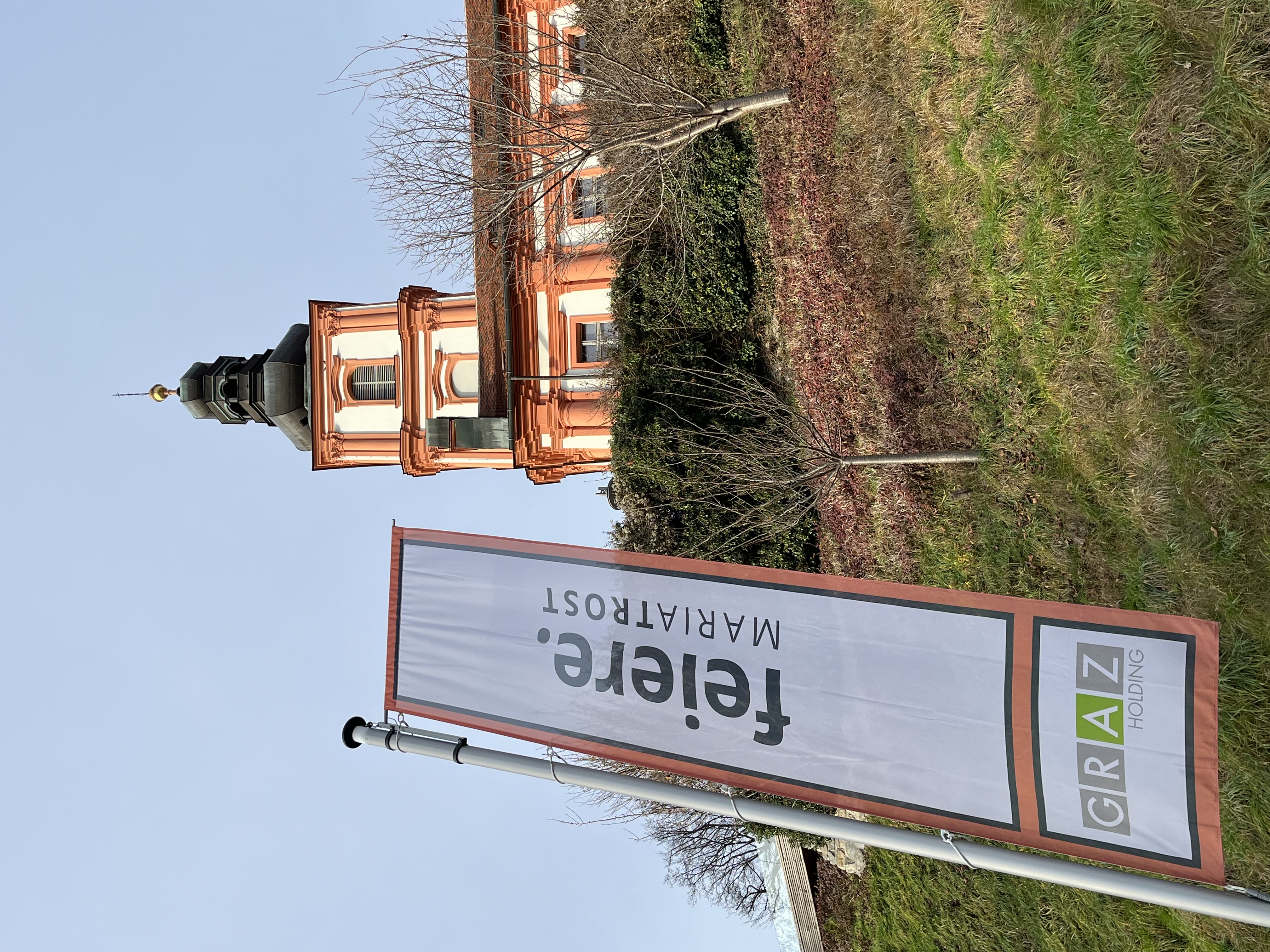 Da flattert etwa: „entdecke MARIATROST“, „gestalte MARIATROST“,  genieße MARIATROST“. – Im Rahmen einer Feier mit Sponsoren, Pfarraktiven und Freunden segnete Diözesanbischof Wilhelm Krautwaschl die Fahnen und wünschte viel Gelingen für die weiteren Schritte des für die steirische Kirche wichtigen Projektes.
