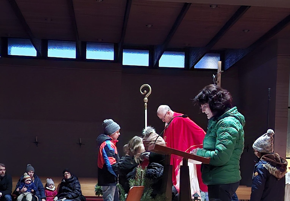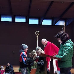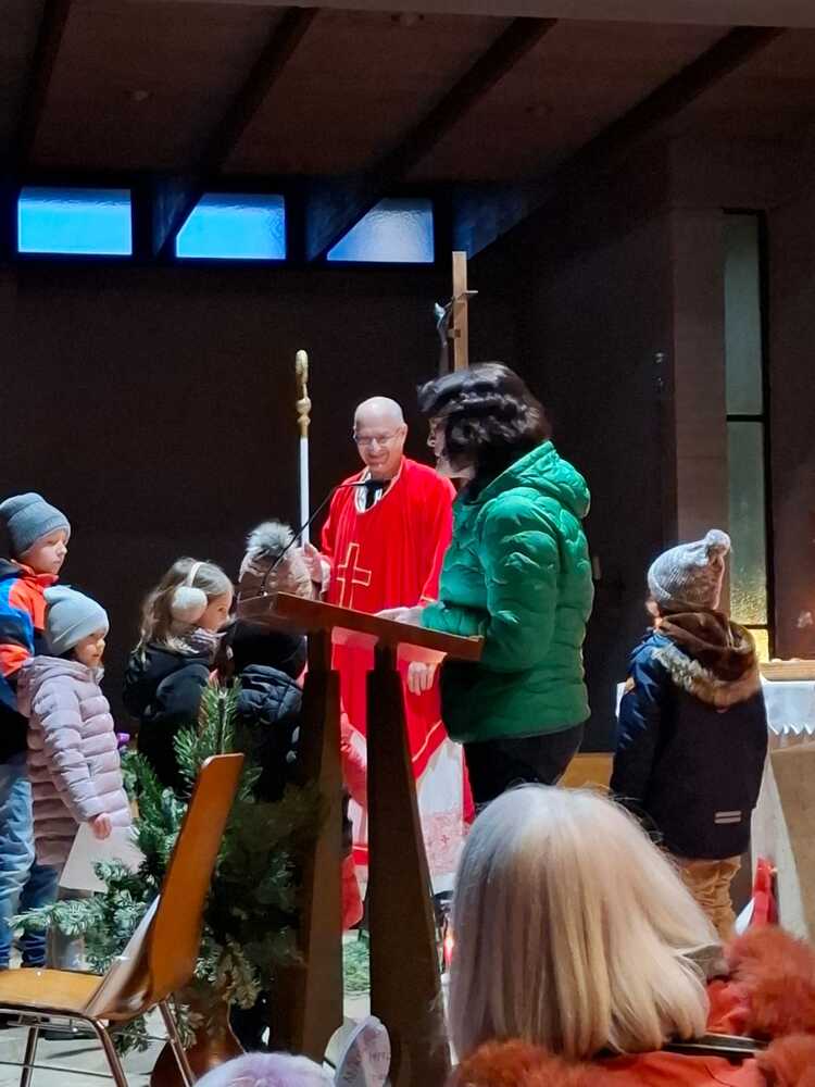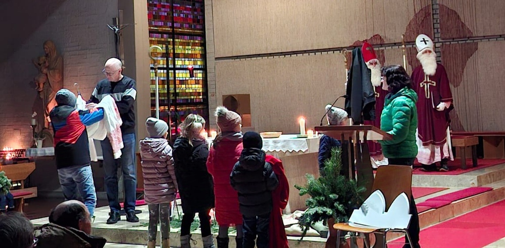 Die Kinder wurden gefragt, woran man den Bischof Nikolaus erkennt und halfen, die im Altarraum verteilten richtigen Erkennungszeichen, die man bei einem Heiligen Attribute nennt, zu finden und Erwin anzuziehen. Dazu gab es schöne Texte und Fürbitten. Als Nikolaus erzählte er dann die Geschichte von den 3 goldenen Kugeln, mit denen der Heilige oft dargestellt wird.
