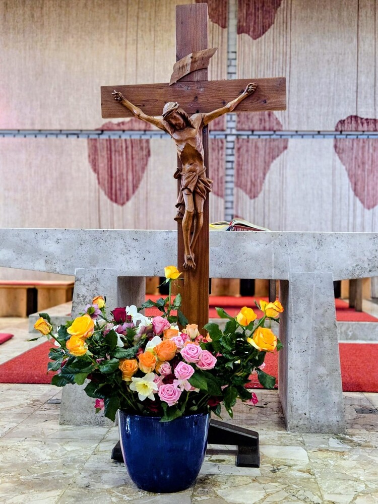 Der Karfreitag wurde in Stille vor dem leergeräumten Altar mit den Zeichenhandlungen der Kreuzverehrung, den großen Fürbitten und der Grablegung begangen. Gestaltet wurde die liturgische Feier von Thomas Possert und einem Ensemble rund um Siegfried Kager.