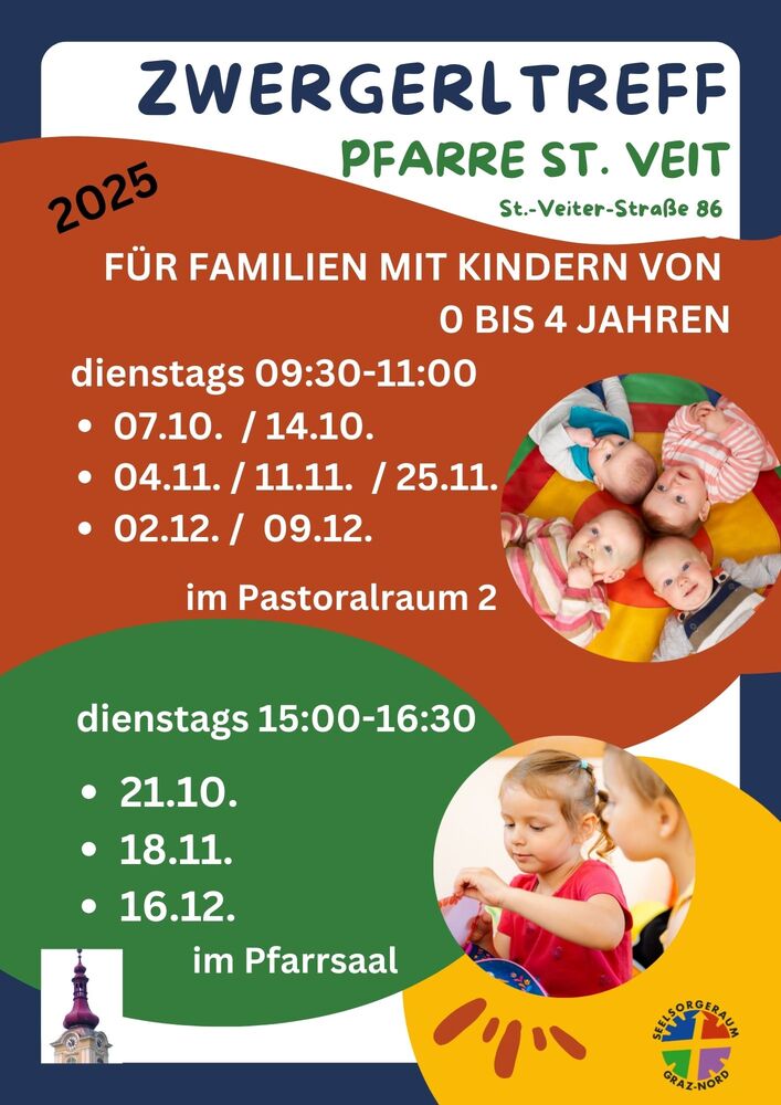 Kinder Zwergerltreff in St. Veit Die nächsten Zwergerltreff-Termine für 2025 in der Pfarre St. Veit mehr: Zwergerltreff in St. Veit