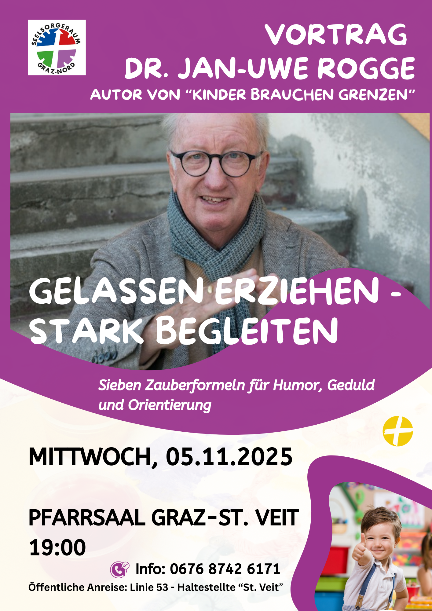 "Gelassen erziehen - stark begleiten" Vortrag von Dr. Jan-Uwe Rogge Mittwoch, 05.11.2025 19:00 - Pfarrsaal Graz-St. Veit mehr: "Gelassen erziehen - stark begleiten" Vortrag von Dr. Jan-Uwe Rogge
